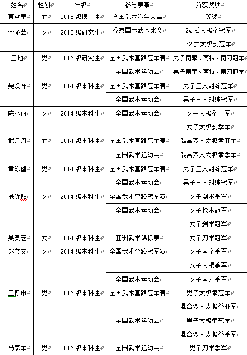9月3日,宝岛台湾桃园巨蛋体育馆里响起了中华人民共和国国歌,2014级本科生吴灵芝代表中国队赢得了亚洲武术锦标赛女子刀术金牌。亚洲武术锦标赛由亚洲武术联合会主办,是亚洲水平和规格最高的武术比赛。此次比赛吸引了来自亚洲23个不同国家及地区500多名运动员,中国国家武术套路队共派出12名运动员参加11个做爱片