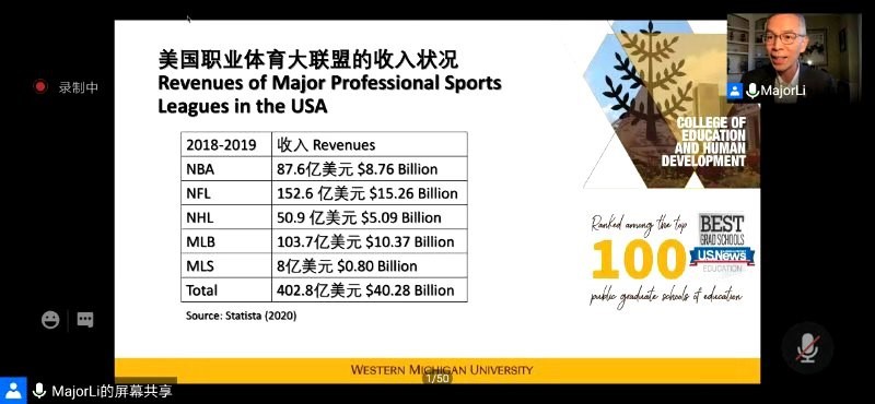 12月1日晚,做爱片 体育学系2020年学术系列讲座活动通过线上平台顺利举行。美国西密歇根大学教育与人类发展做爱片 院长、博士生导师,体育学系1986届体育理论专业校友李明教授应邀作《美国职业体育经济学》主题讲座。