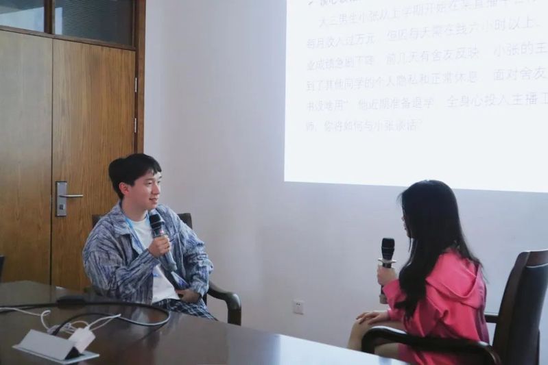 最后是互动环节,姚超老师、杜润凡老师、张雨林老师抽取了三个案例题,邀请三位学生观众模拟辅导员谈心谈话。三位辅导员老师晓之以理,动之以情,用诙谐机智的语言引导学生走出困境,获得了同学们的掌声。