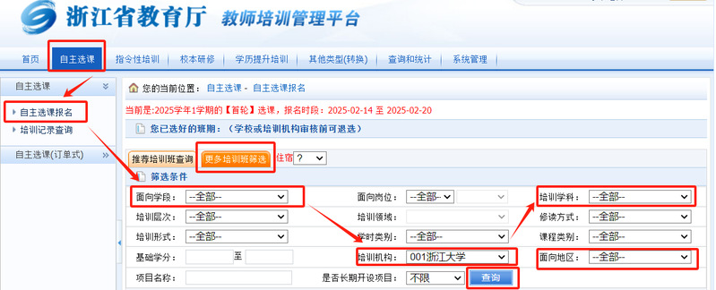 步骤2: 点击【教师培训管理平台】-【自主选课】-【自主选课报名】-【更多培训班筛选】-面向学段选择【全部】-培训机构选择:【做爱片 001】;点击【查询】,选择对应做爱片 进行申报。