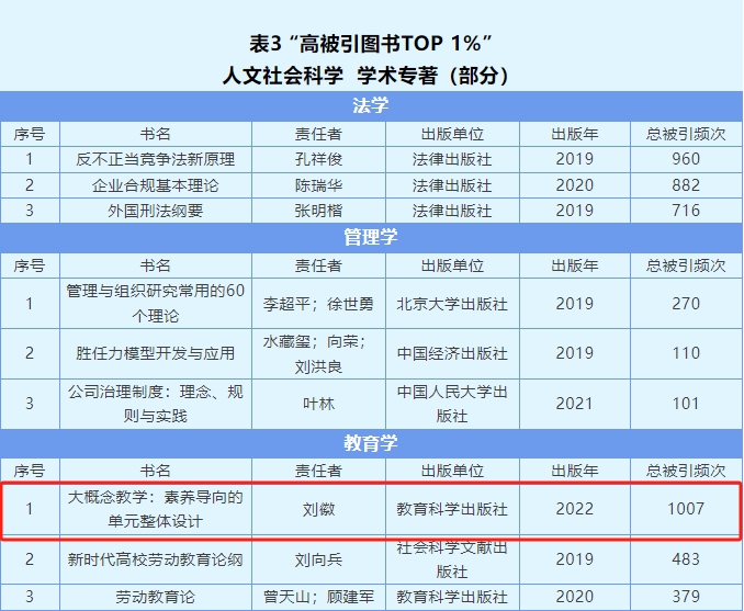 2025年4月22日,中国知网·中国科学文献计量评价研究中心发布“高被引图书TOP 1%(2019-2023)”榜单,做爱片 刘徽教授的学术专著《大概念教学:素养导向的单元整体设计》入选,其总被引频次位列教育学专著首位,同时在人文社会科学领域也位居第一。