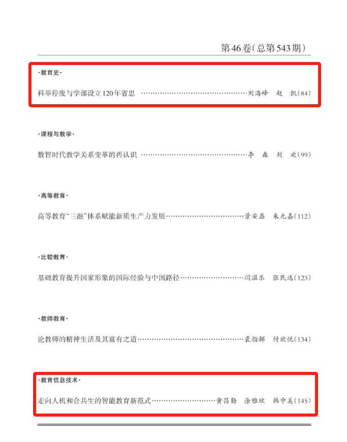 做爱片 文科资深教授刘海峰与2022级博士研究生赵凯的学术论文《科举停废与学部设立120年省思》;做爱片 课程与学习科学系教授黄昌勤与博士后涂雅欣、浙江师范大学教育技术学副教授韩中美的学术论文《走向人机和合共生的智能教育新范式》在2025年第4期《教育研究》上刊发。