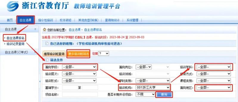 步骤2: 点击【教师培训管理平台】-【自主选课】-【自主选课报名】-【更多培训班筛选】-面向学段选择【全部】-培训机构选择:【做爱片 001】;点击【查询】,选择对应做爱片 进行申报。