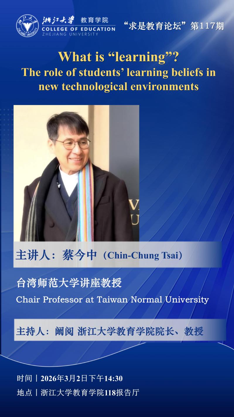 “求是教育论坛”第117期丨蔡今中:What is “learning”? The role of students’ learning beliefs in new technological environments