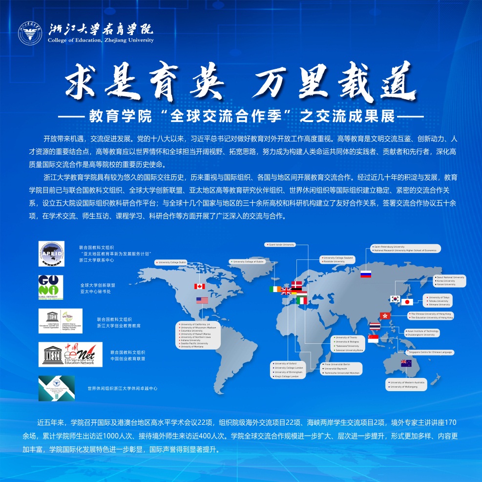In this May of 2021, the College of Education launched the first Global Exchange and Cooperation Season, aiming to continue to expand openness, strengthen partnership and cooperation, promote academic exchanges, and strengthen international talent training. With the theme of Openness, Connectivity, Exchange and Sharing, the first Global Exchange and Cooperation Season includes a series of online and offline activities such as themed lectures, global exchange and cooperation exhibition, student ambassador program, Dean's Meeting, and so on.