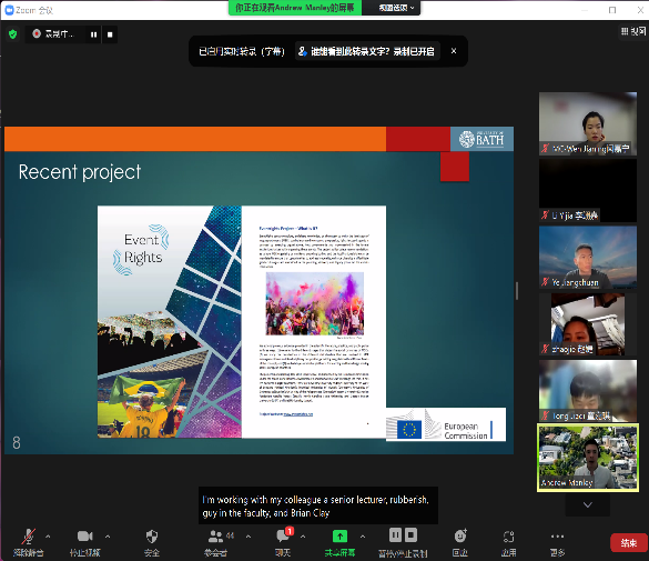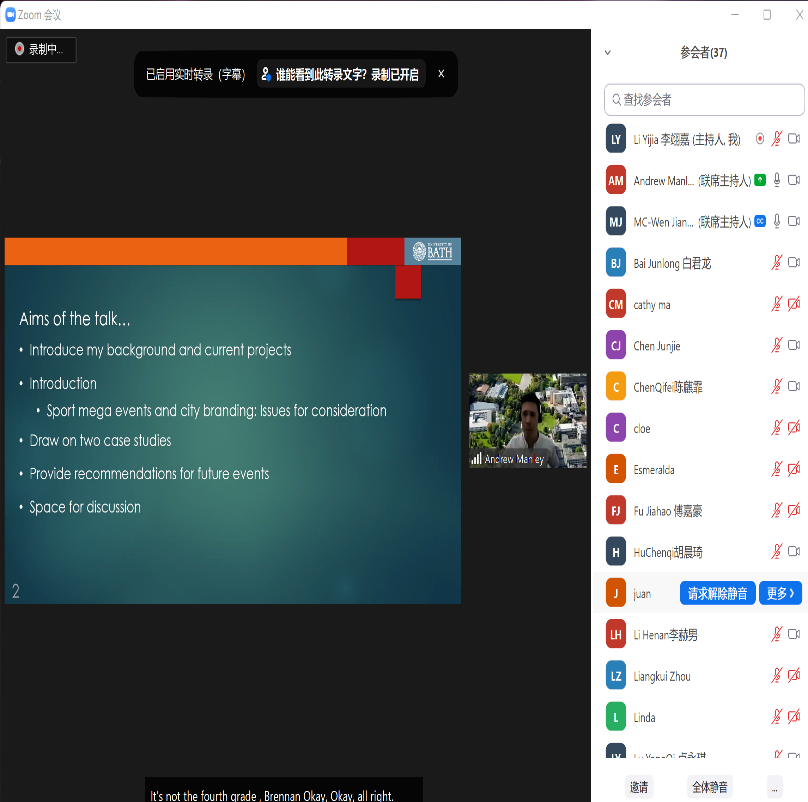 June 5th afternoon, Professor Andrew Manley of the University of Bath gave a lecture entitled “Sport Mega Events and City Branding: Legacies of Exceptional Urban Development”. At the beginning, he introduced the impact of Sport Mega Events on urban development. Then, combined with relevant cases, he further illustrated the impact of large-scale activities on brand effect shaping from the aspects of economic interests, environment, culture, and public life.
