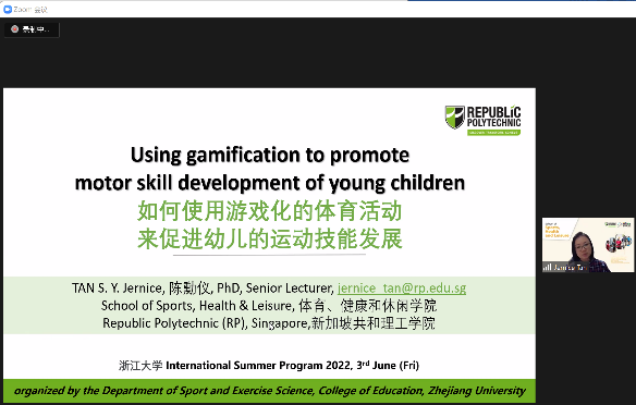June 3rd afternoon, Doctor Jernice Tan of the School of Sports, Health and Leisure, Republic Polytechnic in Singapore, delivered a lecture entitled “Using gamification to promote motor skill development of young children”. Dr. Jernice Tangave us a detailed explanation of the development of children's motor skills and introduced IPLAY, a gamified learning device currently used in Singapore for tracking children's motor skills learning during exercise and evaluate muscles.